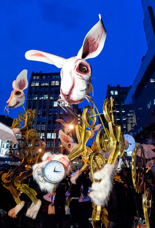 Tick, tock... Time haunts us. The hours tick mercilessly away towards a finite end, even as the sound of passing seconds reassures us of the continuity of our universe, a mechanical heartbeat, continual and infinite. But how well do we know Time? We think of time as immutable, yet we know it to be elastic. It bends and stretches, like Dali's drooping watch-faces and Einstein's speeding trains, as certain moments pass with glacial slowness, while others speed by. We think of time as intangible, yet we know it only through physical objects: swinging pendulums, unwinding cogs, or orbiting celestial bodies. We think of time as infinite, yet physicists have calculated its beginnings, as ancient calendar-makers envisioned its end. For the 40th Annual Village Halloween Parade, we explored the two faces of Time (as described by Mircea Eliade): tempus, the measured linear march from birth to death; and templum, the cyclical affirmation of rhythm, ritual, and rebirth. For our journey through Time, the White Rabbit (of Wonderland renown) is our guide. We meet him en route, pocket-watch at the ready, and very late -- like us, he is rushed along by the passing instants, harried by a flock of flying alarm clocks (time flies, indeed!) and enmeshed in a costumed churning clockwork of gears and timekeepers. This is worldly, historical time: linear, inexorable, mortal. But then something happens. The clock strikes 12. Alarm bells ring, and all motion ceases. Then, a carousel of clock faces blooms out of nothing, forming a circular stage. A flickering light appears and we see a stage of moving shadows, a giant zoetrope on which we meet rabbit again, now liberated from his mechanized regime and playfully leaping over the tortoise in an endless circle game. This is cyclical time, seasonal time, dream time, repeating and reaffirming, deathless and eternal. Meanwhile, outside the carousel, time for the clockwork figures has slowed to a stop-motion tableau. For a moment – which might be an eternity – we enter a time out of time, in which a lifetime might be lived in the interval between two ticks of the clock.