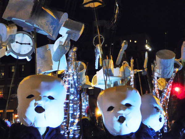 One thinks of Halloween as a chance to fantasize, but more than anything Halloween lets us realize, allowing us to play ourselves and open our eyes to the astounding everyday world around us. This year we led the 43rd Annual Village Halloween Parade with Reverie, deploying a raucus, luminous cloud of domestic objects – coffee mugs, watering cans, easy chairs, toilets – to conjure those moments when the familiar seems suddenly strange; when a place, a word, an object encountered a thousand times before, pops precariously into our awareness, before retreating back into the hypnosis of the ordinary. In these moments of reverie, our eyes are fresh, a child's eyes. Unfettered by habit, ideas and inspirations swirl in, even as we are haunted by the feeling that the concrete world is but a waking dream, our own creation. Familiar, yet eerily clad in white, our flotilla of performing objects glided past above a march of two dozen veiled umbrellas. As chimes rung out, the umbrellas lowered slowly, revealing the awe-struck masquerade of Butoh-inspired children's faces looking skyward at the undimmed wonder of ordinary life, inviting one and all to reawaken to the world around us.
